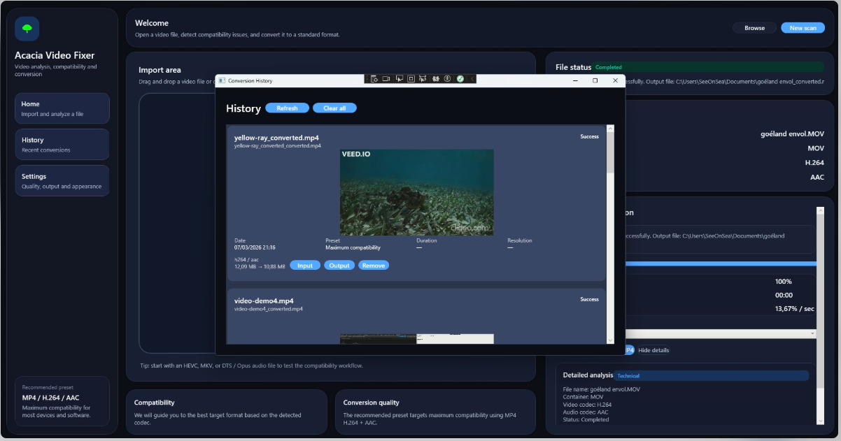 VideoFixer is a modern desktop app that helps you inspect, convert, and optimize video files for better compatibility. If you have a video that will not play properly on a device, app, website, or media player, VideoFixer makes it easy to convert it into a more widely supported format: MP4 with H.264 video and AAC audio. Designed with a clean interface and a simple workflow, VideoFixer is ideal for users who want reliable results without dealing with complicated encoding tools. Why use VideoFixer? Some video files are not fully compatible with all platforms. They may use unsupported codecs, unusual containers, or settings that cause playback problems. VideoFixer helps you solve these issues by analyzing the source file and converting it into a more standard, playback-friendly format. Whether you are fixing a personal video, preparing content for sharing, or converting files for playback on another device, VideoFixer gives you a fast and straightforward way to get the job done. Main Features Video analysis before conversion Inspect technical information from your files to better understand compatibility issues. Convert to MP4 (H.264 + AAC) Create videos in one of the most widely supported formats for modern devices and apps. Conversion presets Use predefined settings for consistent results and faster workflows. Drag and drop support Open files quickly with a simple, intuitive workflow. Live progress tracking Follow conversion progress with a progress bar, speed indicators, and estimated remaining time. Detailed information panel View useful file and conversion details in a clear interface. Conversion history Keep track of previous conversions and review your recent processing activity. User settings Customize output behavior and app preferences to fit your workflow. Simple and efficient workflow VideoFixer is built for ease of use: Select your video file Review the file information Choose a preset Start the conversion Save and use your new compatible MP4 file No complicated setup. No advanced encoding knowledge required. Local processing and privacy VideoFixer processes your video files locally on your PC. Your files are not uploaded to external servers, making the app a practical choice for users who value privacy and control over their content. Who is VideoFixer for? VideoFixer is useful for: users who need more compatible video files creators preparing videos for sharing anyone dealing with playback issues users who want a simple alternative to complex media conversion tools Clean desktop experience Built as a modern Windows desktop application, VideoFixer focuses on clarity, speed, and usability. The interface is designed to keep the essential tools easily accessible while still providing detailed information when you need it. If you want a fast, simple, and reliable way to convert videos into a more compatible MP4 format, VideoFixer is ready to help.