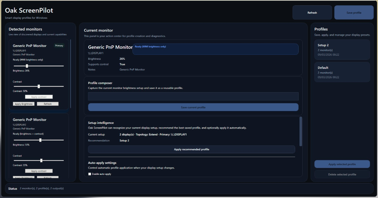 Oak ScreenPilot is a modern Windows utility designed to help you manage and optimize your multi-monitor setup with ease. Whether you work with a single screen, a dual-monitor desk setup, or a laptop connected to external displays, Oak ScreenPilot lets you quickly control brightness, organize display configurations, and apply smart monitor profiles tailored to your workflow. The application detects your connected monitors and allows you to adjust brightness and supported display settings from a clean and intuitive interface. You can create profiles for different environments such as work, home, or mobile setups, and switch between them instantly. Oak ScreenPilot also helps you maintain a comfortable viewing experience by allowing you to fine-tune your monitor settings without navigating complex system menus. All profiles and settings are stored locally on your device, ensuring privacy and reliability while giving you full control over your display environment. Oak ScreenPilot is designed for developers, creators, professionals, and anyone who works with multiple displays and wants a smarter way to manage their screen environment.