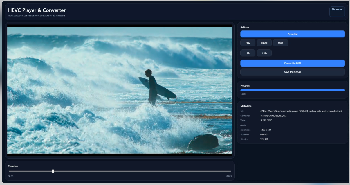Open HEVC / H.265 videos quickly and convert them to standard MP4 for easier playback on more devices and apps. HEVC Player & Converter is a simple Windows app designed for one job: helping you open HEVC videos, preview them, and save a more compatible MP4 version in a few clicks. Whether your file comes from a phone, camera, drone, or another device, the app lets you inspect the video, view key file details, extract a thumbnail, and convert the file to a format that is easier to play, share, and edit. Why use HEVC Player & Converter? Many HEVC / H.265 videos do not play smoothly in every app or on every device. This app helps you open those files and create a standard MP4 version for easier everyday use. What you can do Open HEVC / H.265 video files Preview videos inside a clean built-in player Convert HEVC videos to standard MP4 View useful file information such as codec, duration, resolution, and file size