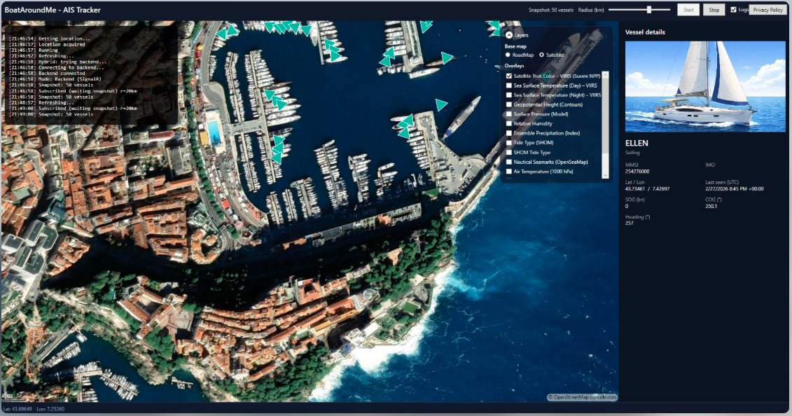 BoatAroundMe AIS Tracker is a modern Windows app that lets you explore nearby vessels in real time using AIS (Automatic Identification System) data. Designed with a clean map-based interface, the app automatically detects your location and displays ships around you with live position updates, heading direction, vessel type, and detailed vessel information. Try the app free for 1 day
